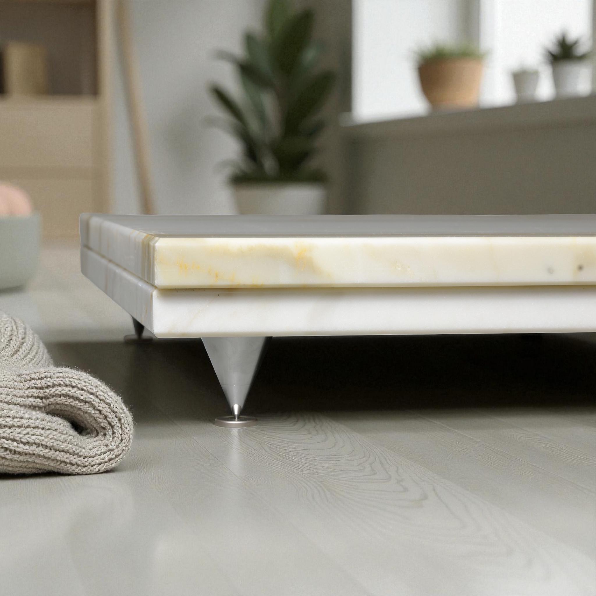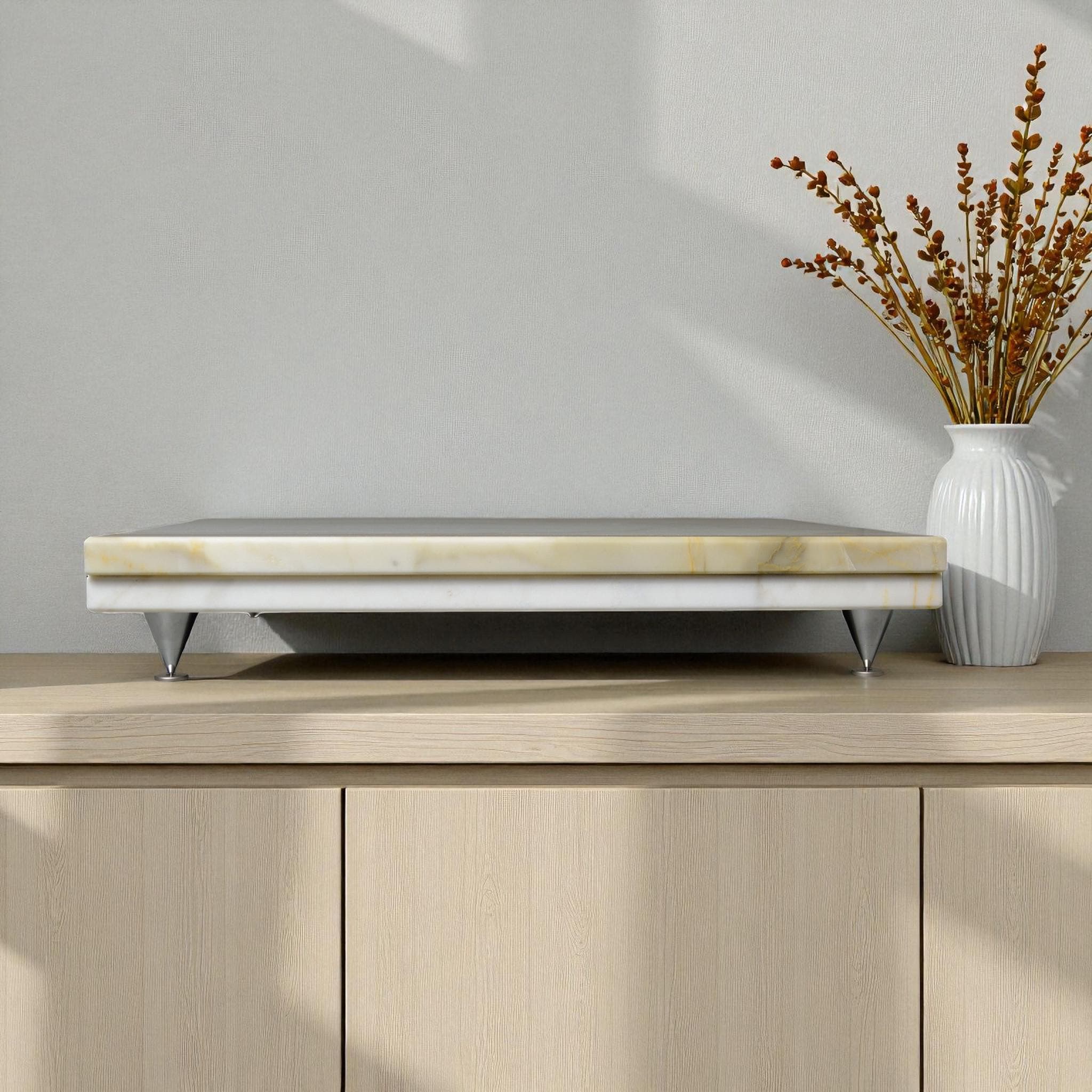 Crafted from a solid slab of premium Italian marble, this platform blends audio precision with sculptural beauty. The natural green veining against a soft white background creates a sophisticated foundation for your high-end audio system.