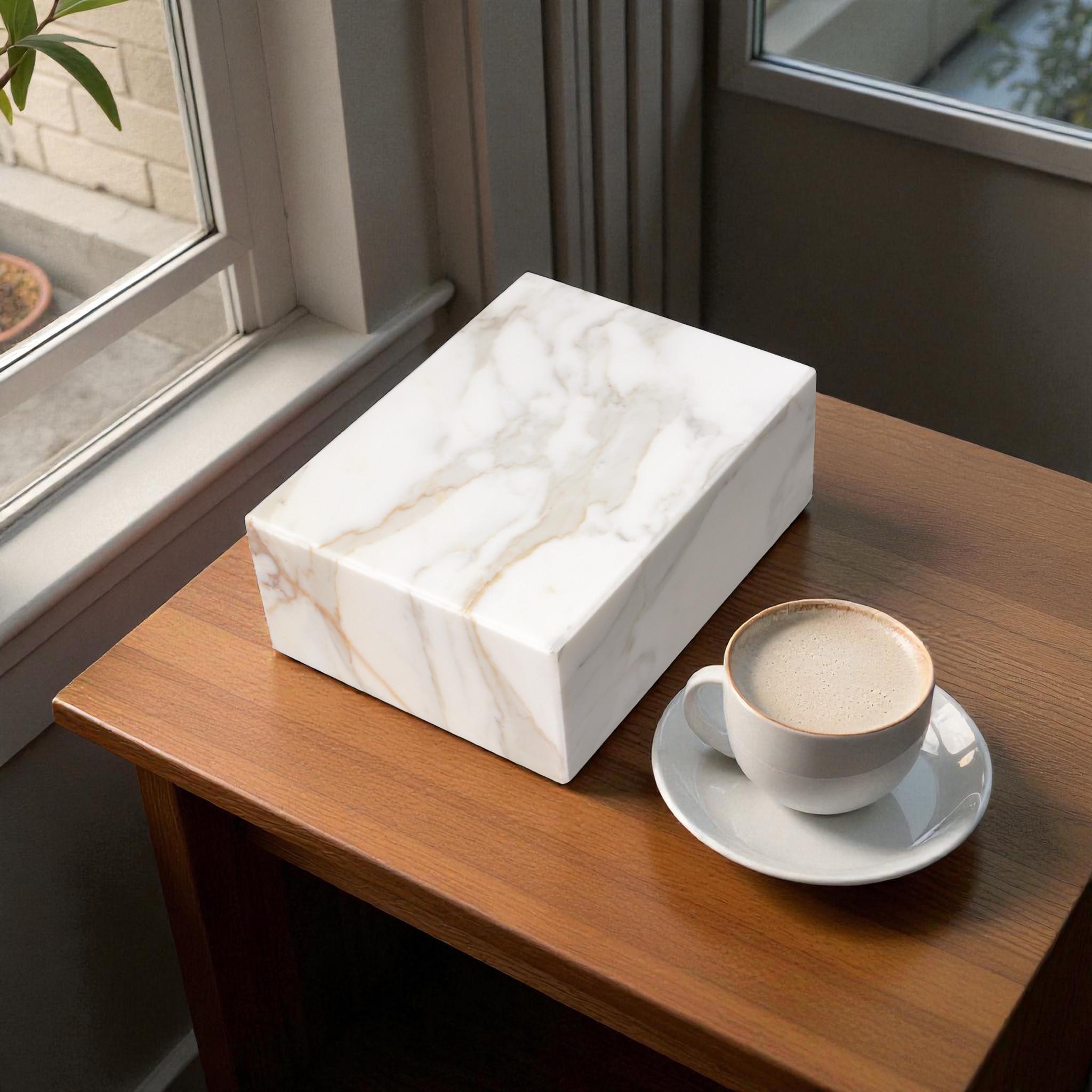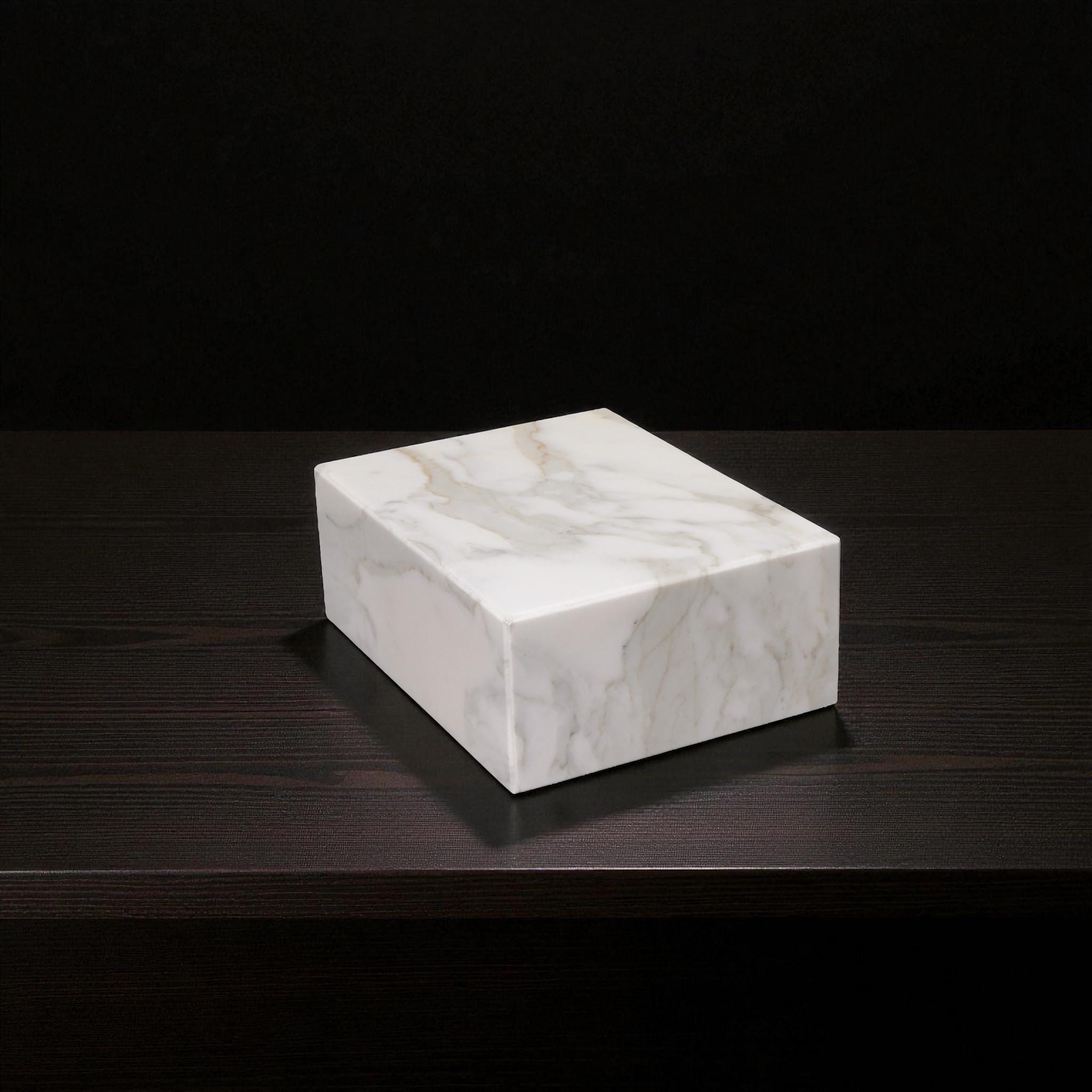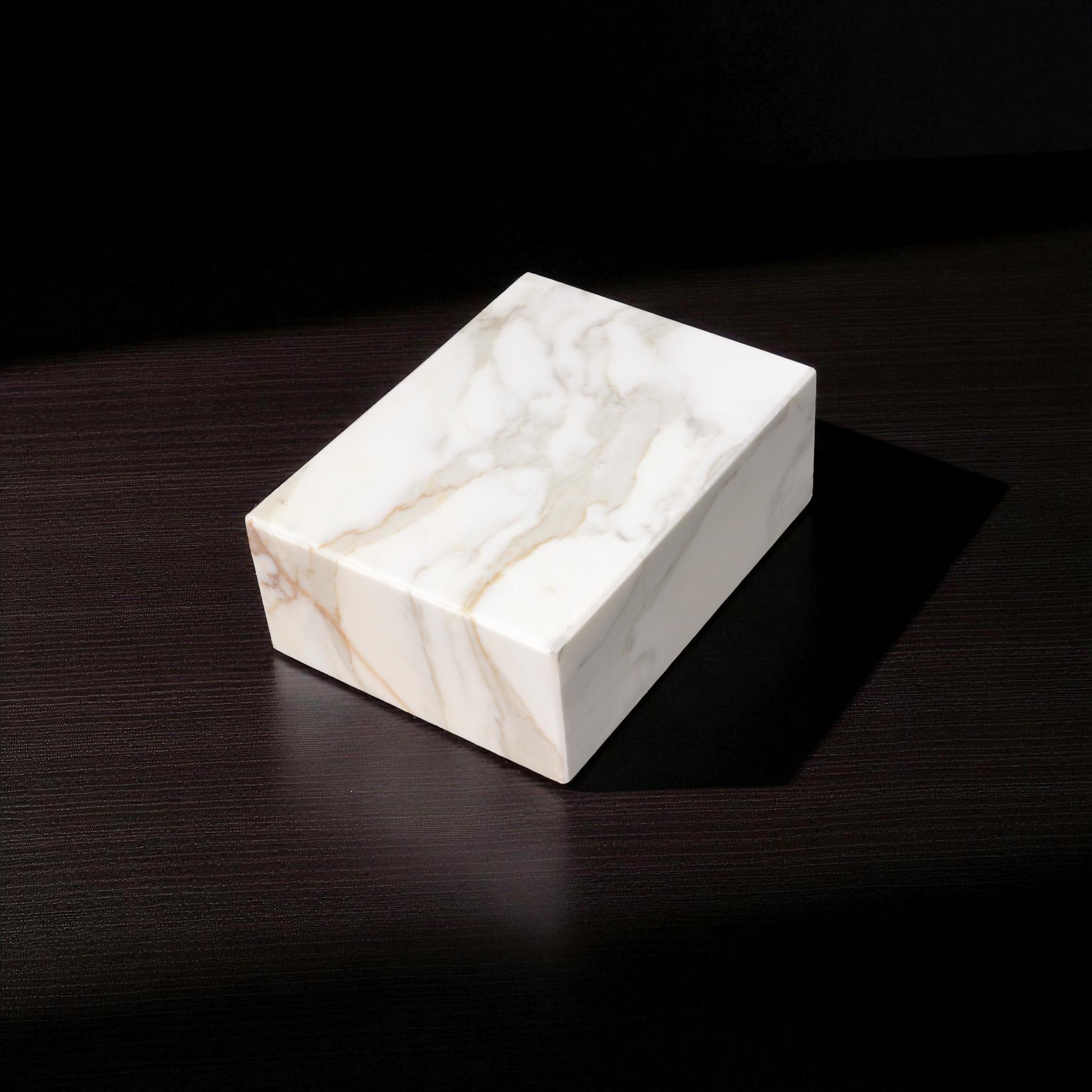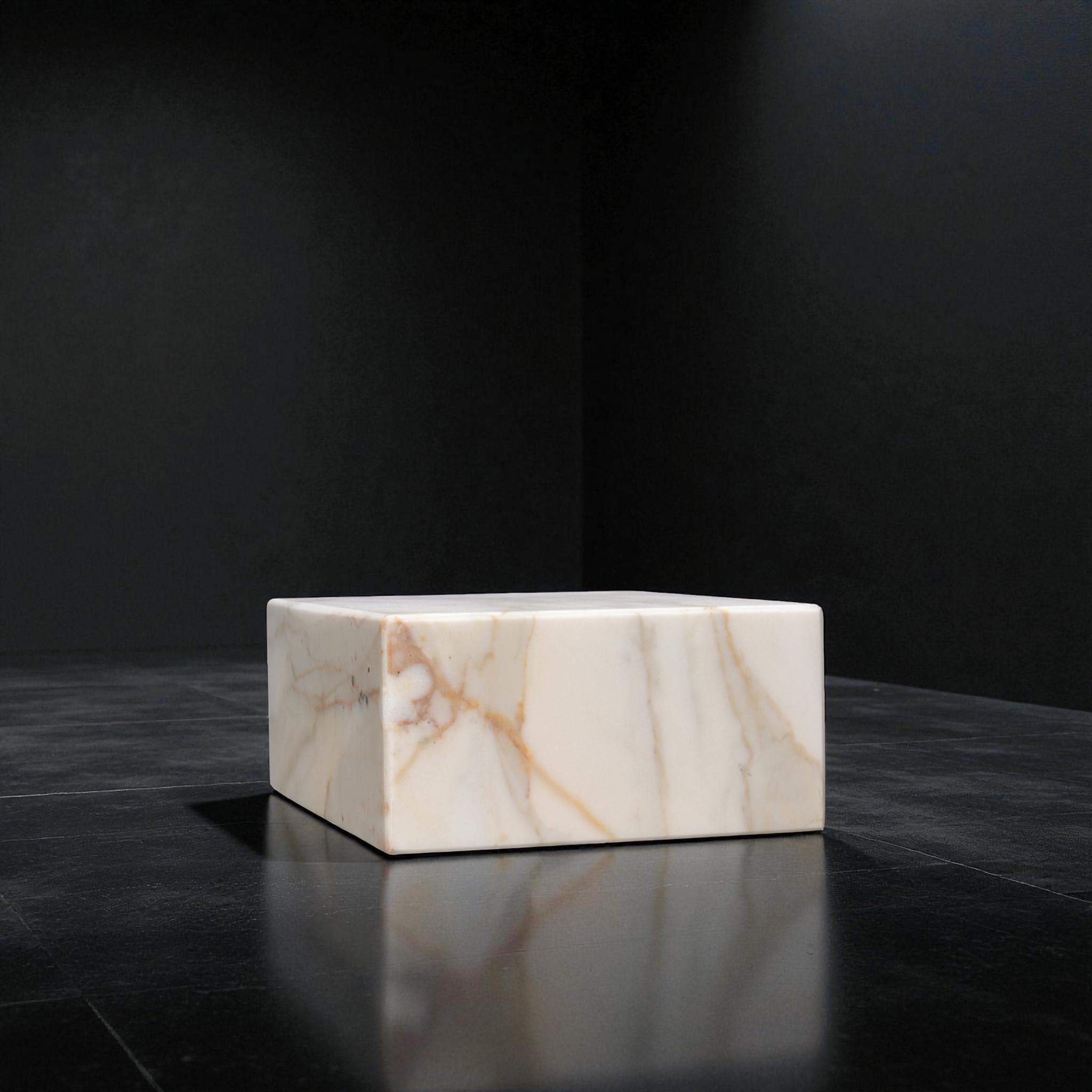 This base is made from Calacatta Gold marble with a smooth honed finish. It’s crafted from a stone remnant, giving leftover material a new purpose. The warm gold lines and soft white tone make it a great stand for sculptures, small art pieces, and home décor. Each piece is cut and finished by hand, so every base has its own natural look.