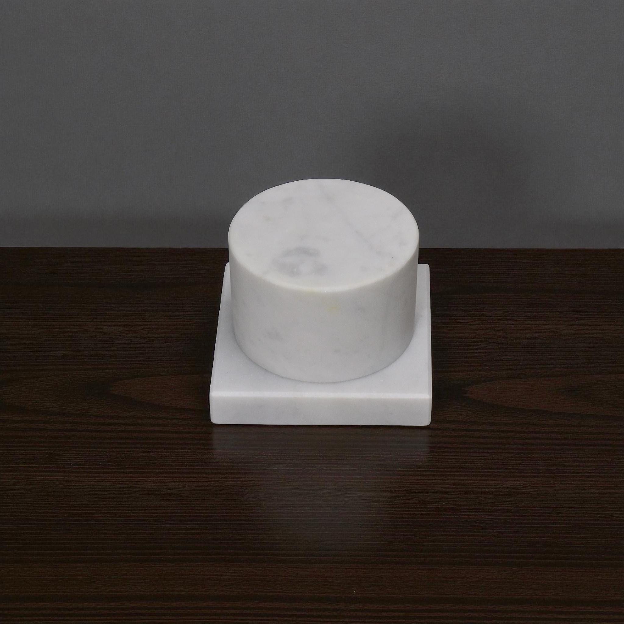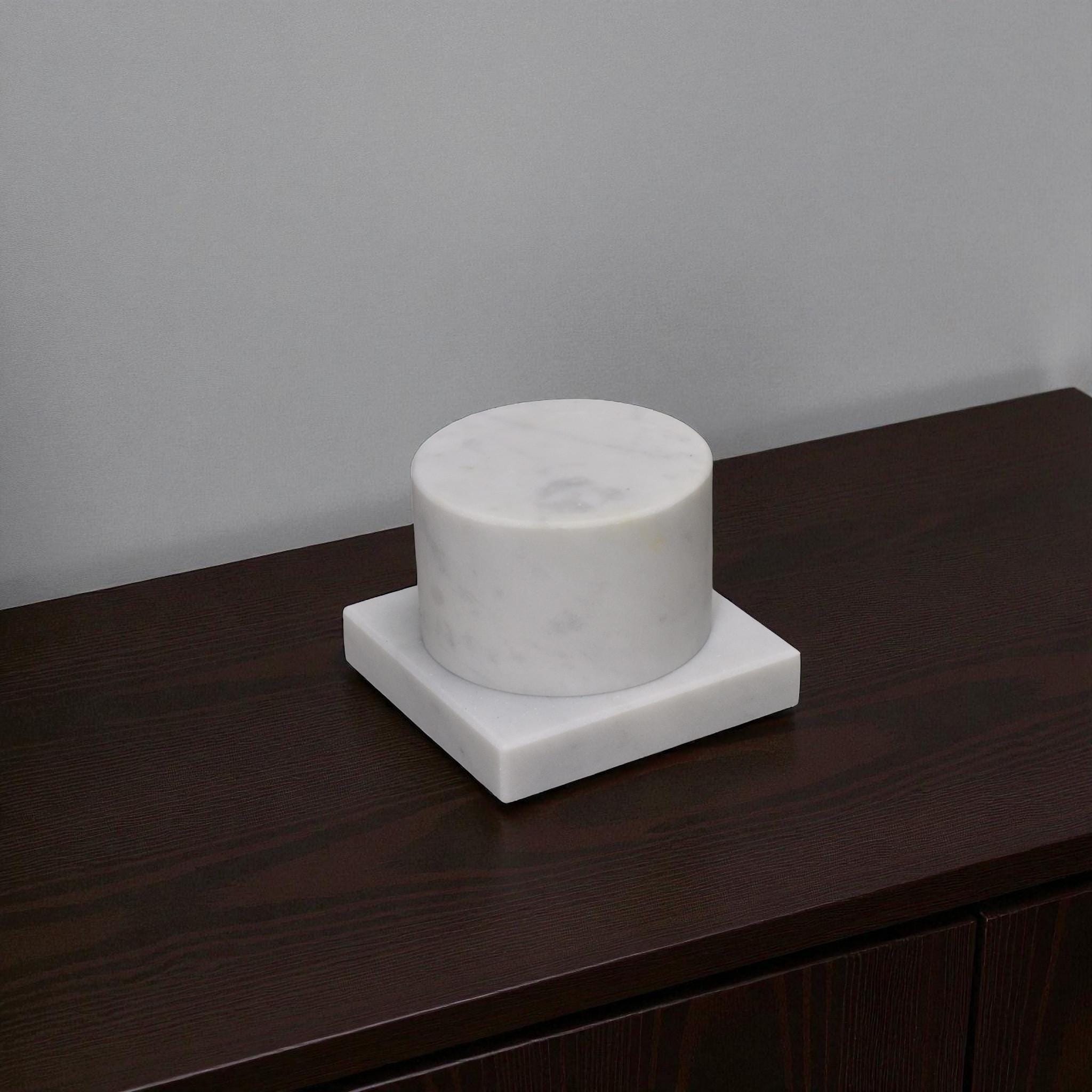 The design features two layers, a square base and a smaller round top, creating a clean and balanced look.