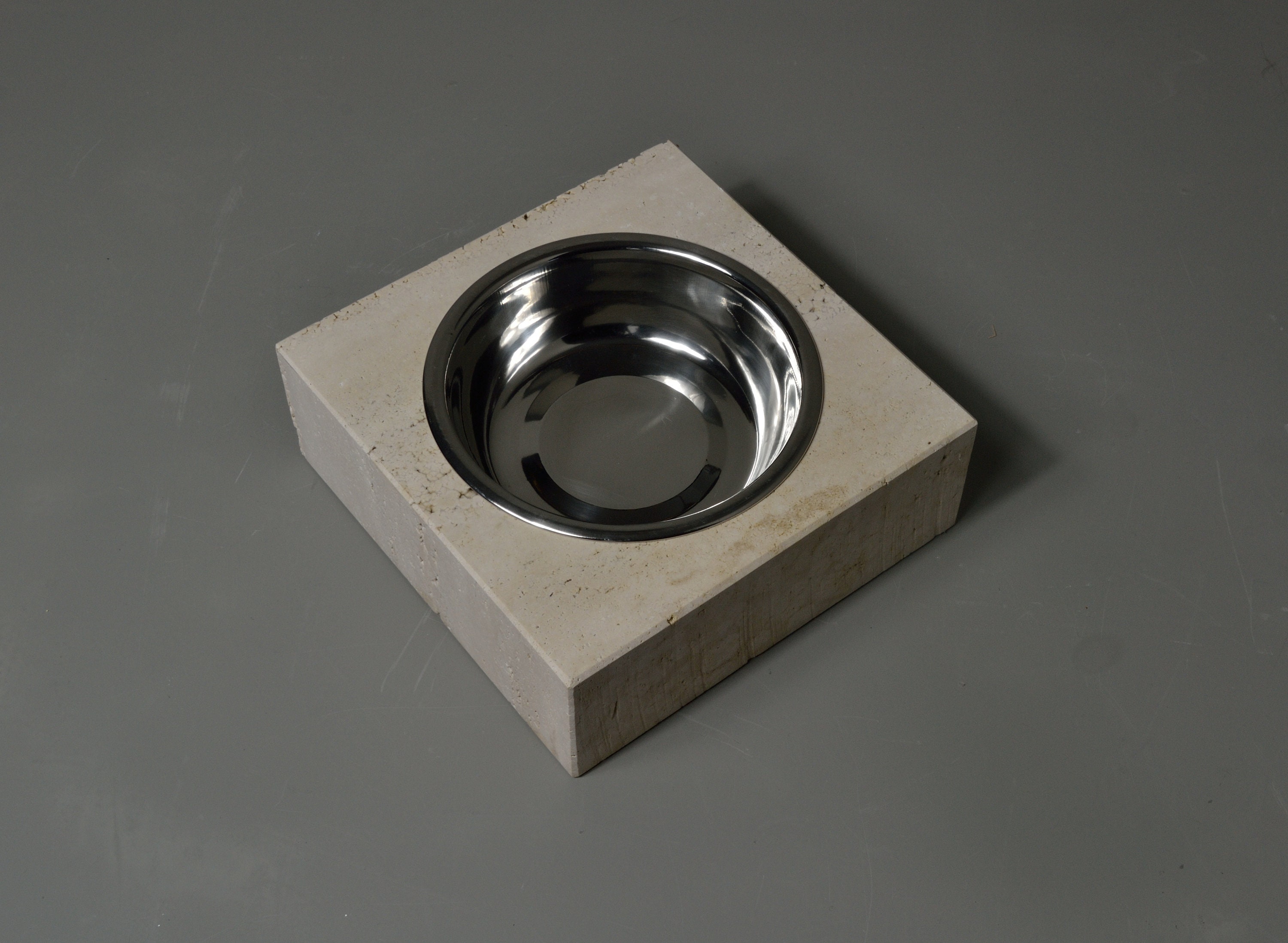 Tops are made from solid stone Travertine with rough edge. 1/8" champers around . Heavy very hard to move when Dog eat. Stainless steel bowls (14oz) included.