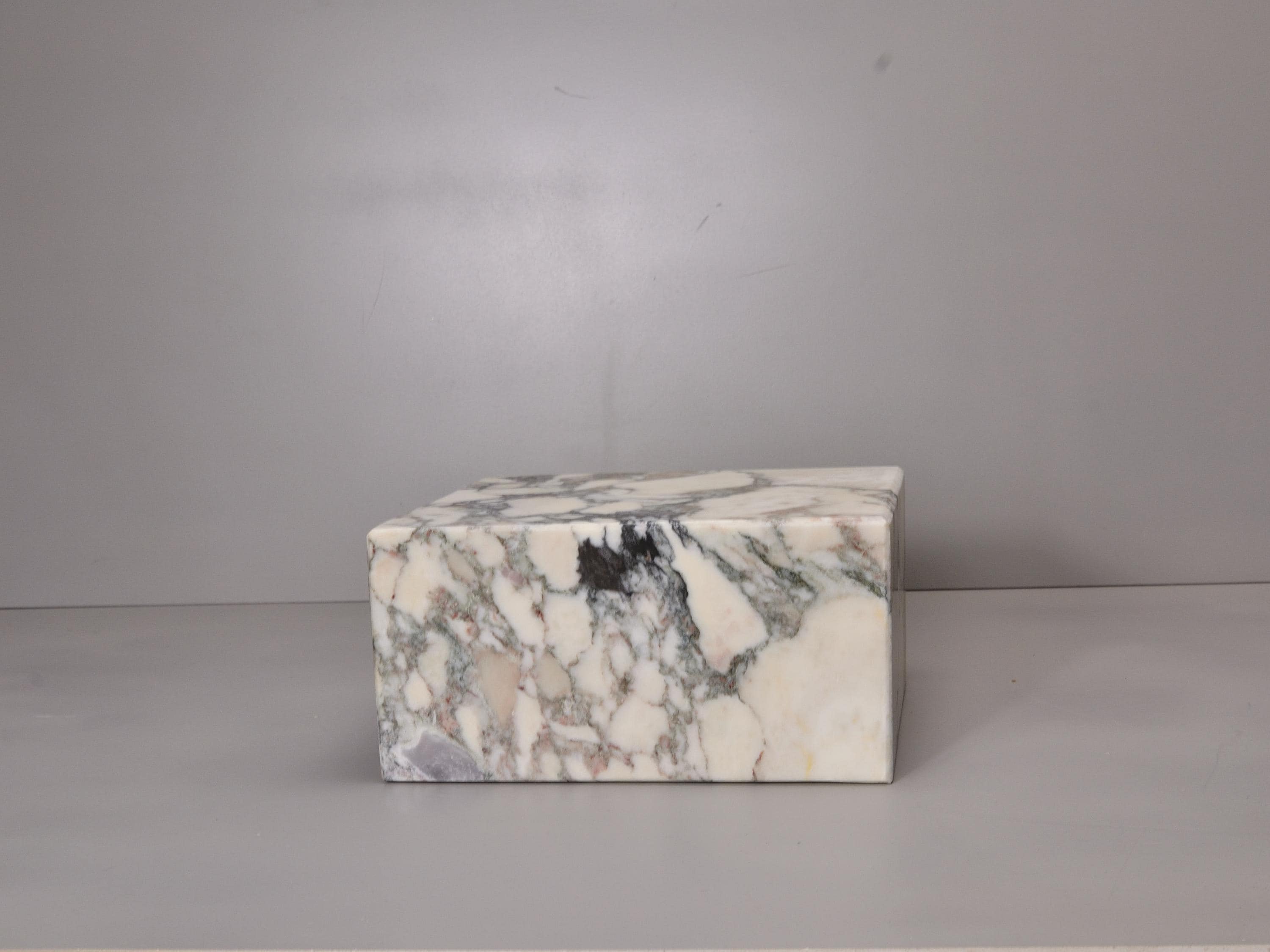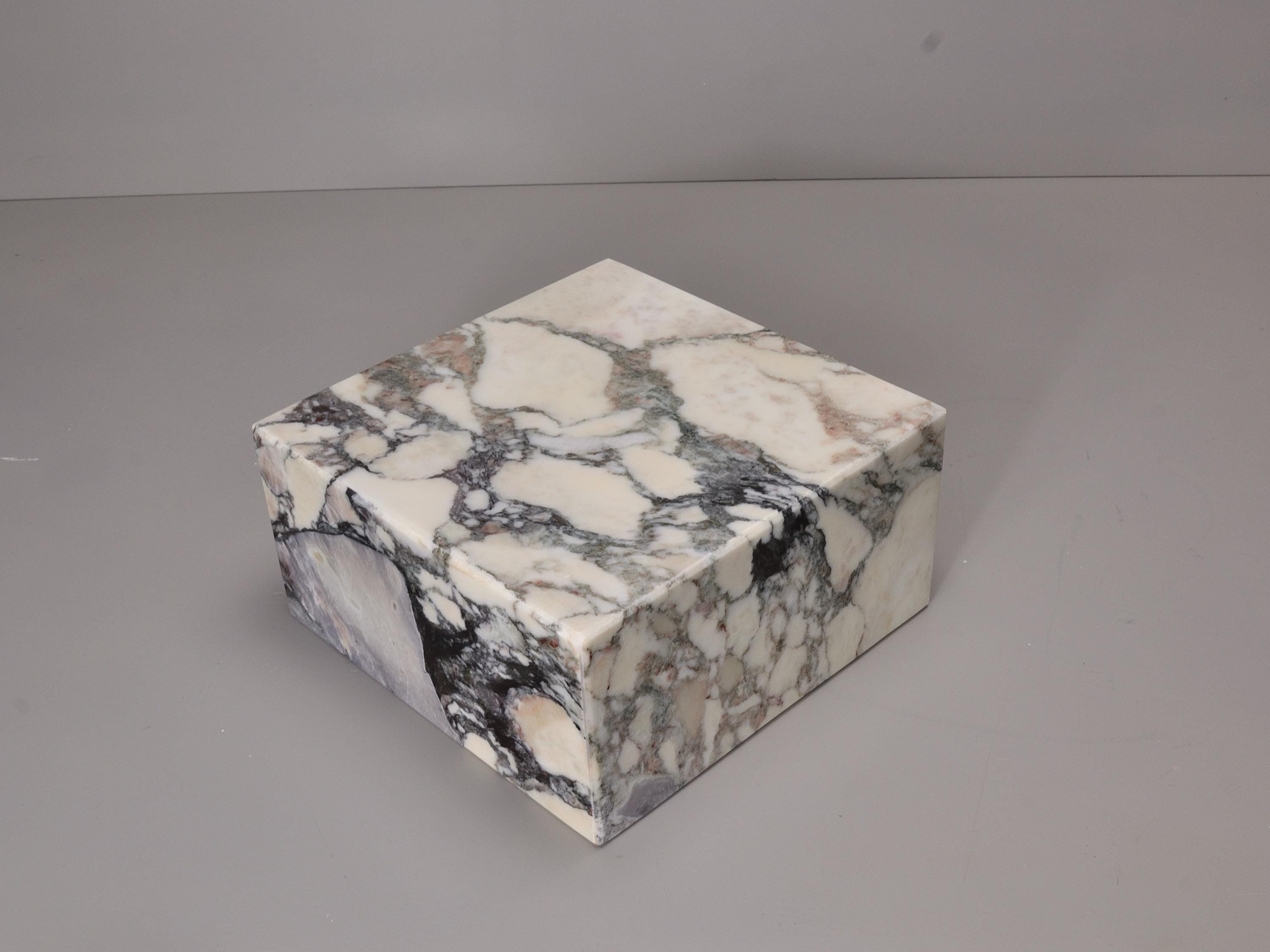 This display base is made from Calacatta Viola marble, known for its white background and deep purple veining. Solid, heavy, and stable, it’s designed to support sculptures, art objects, crystals, or collectibles.