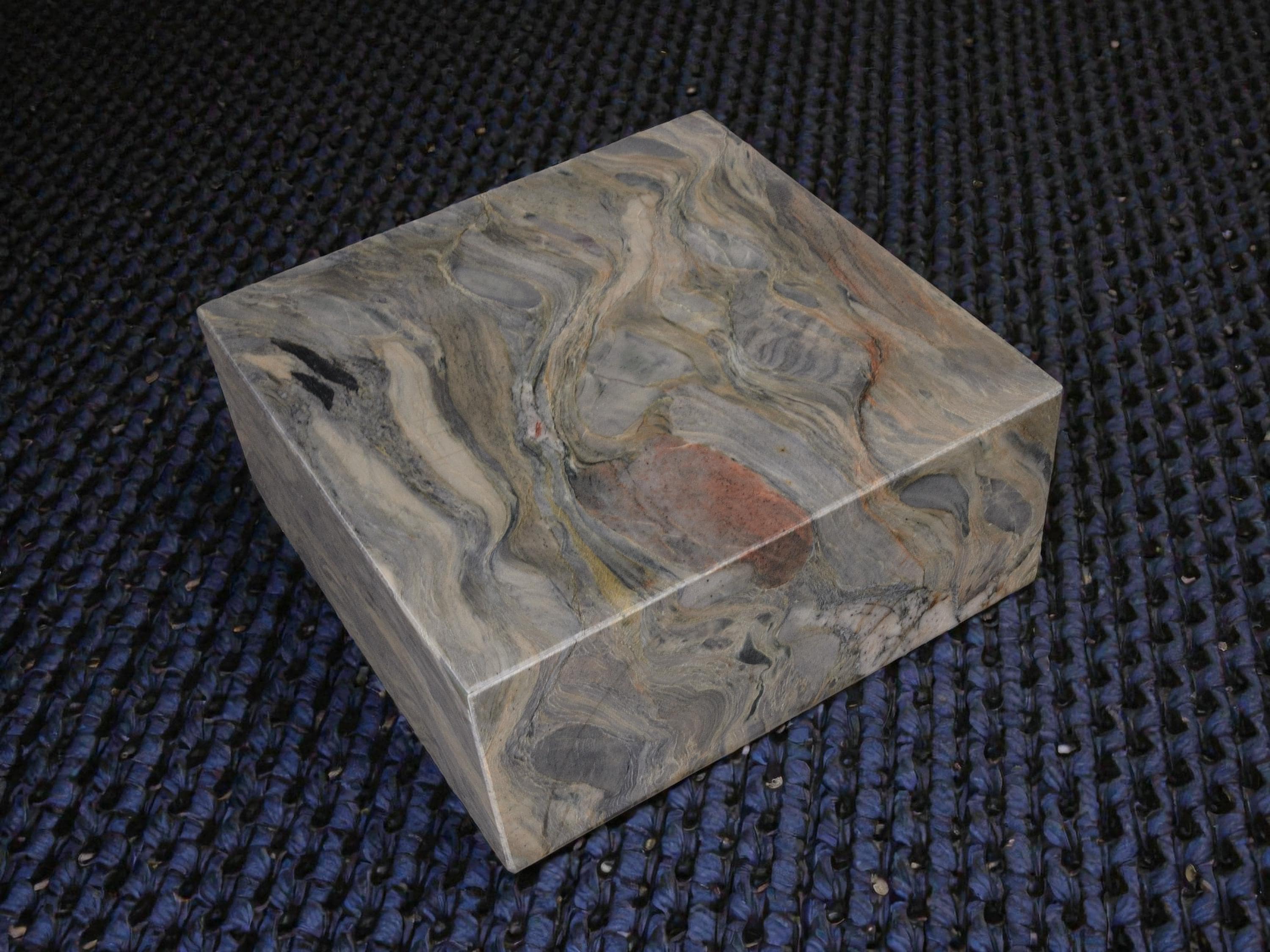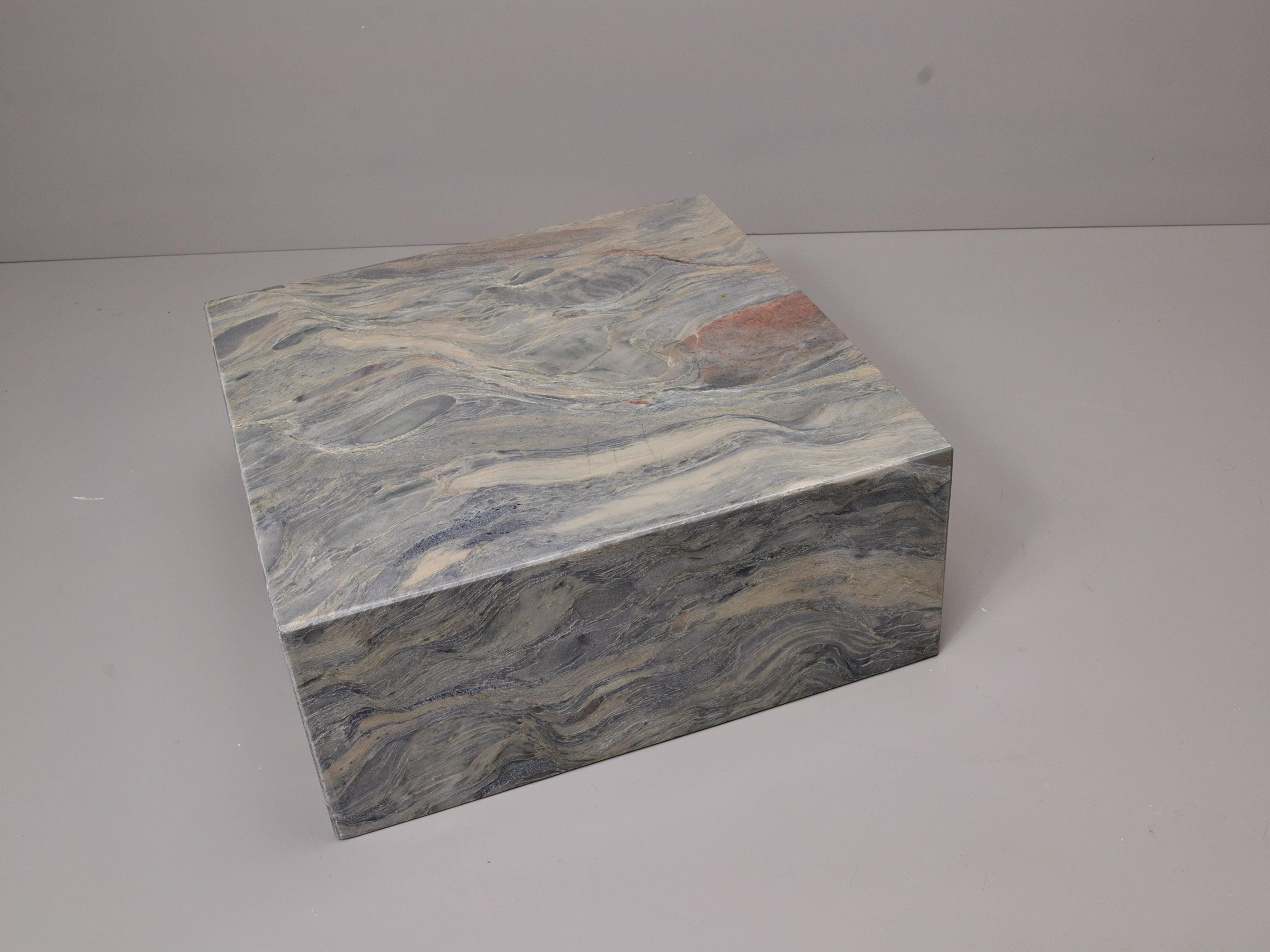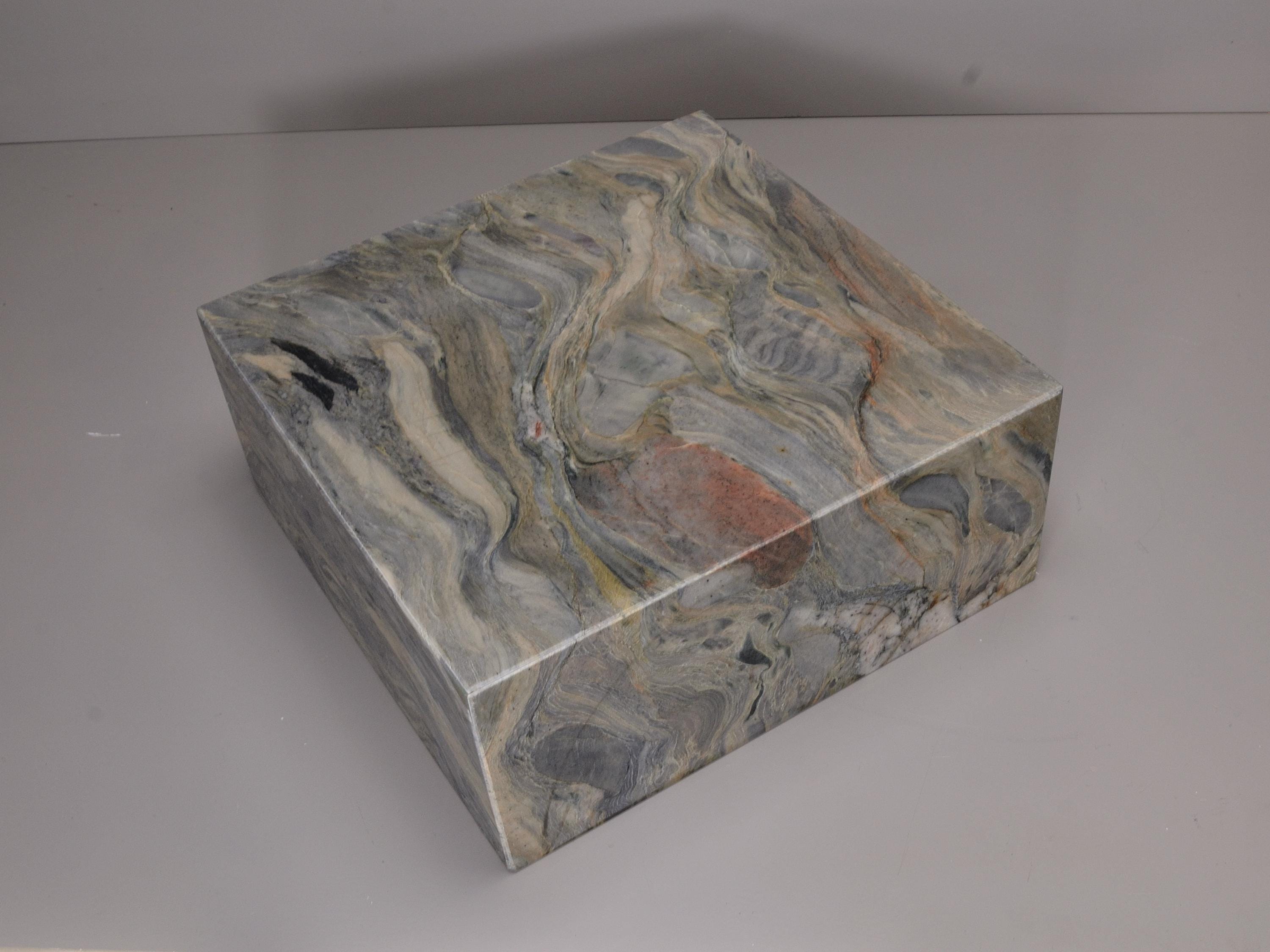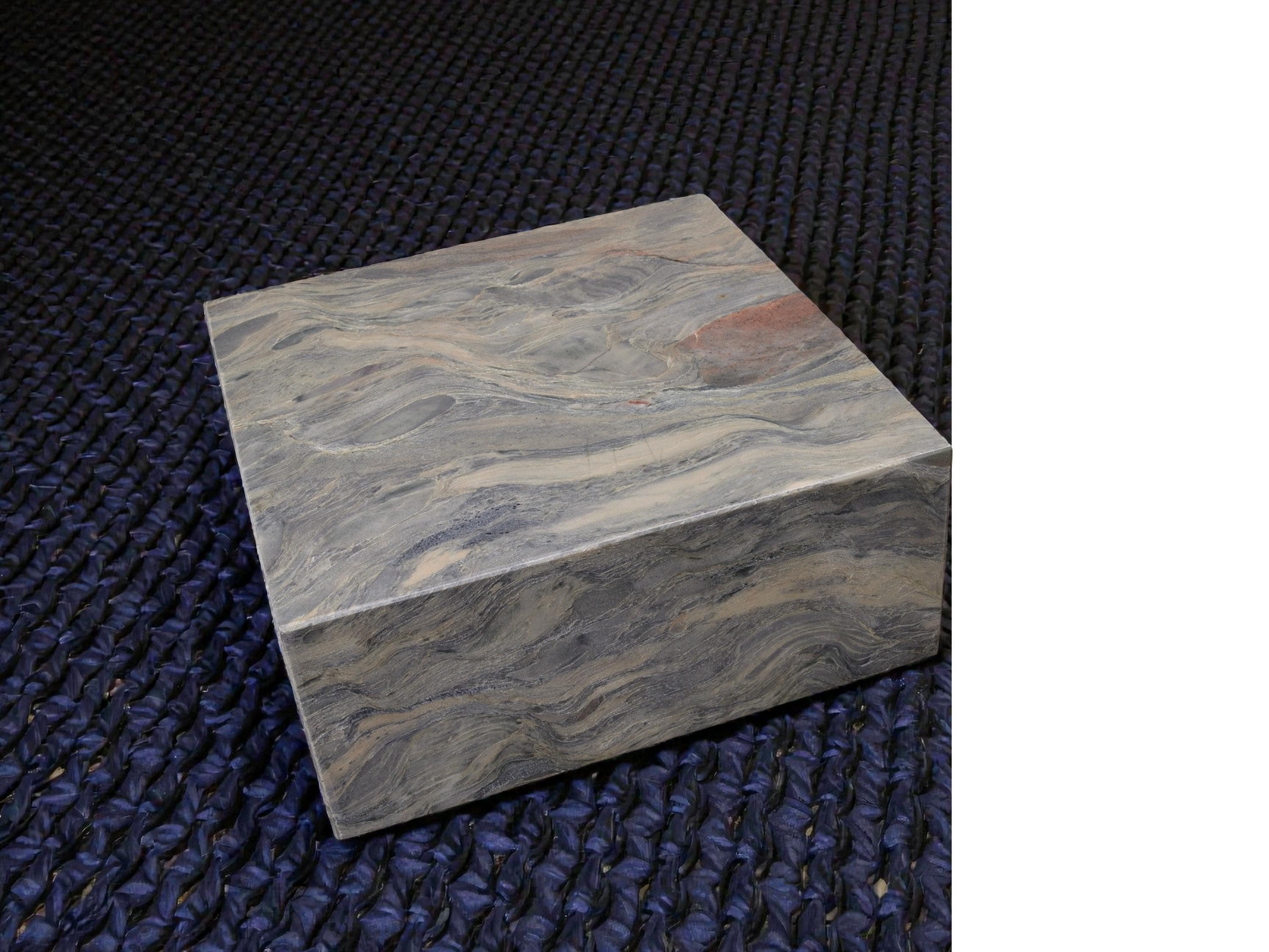 This display base is made from natural stone with flowing gray, blue, cream, and warm accent tones. The stone has strong movement and natural patterns, making each base truly one of a kind. Solid and heavy, it provides a stable foundation for sculptures, art objects, crystals, or collectibles.
