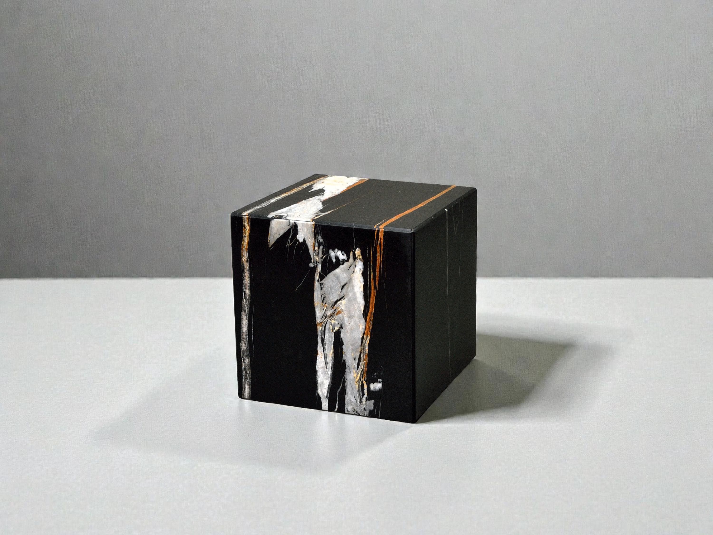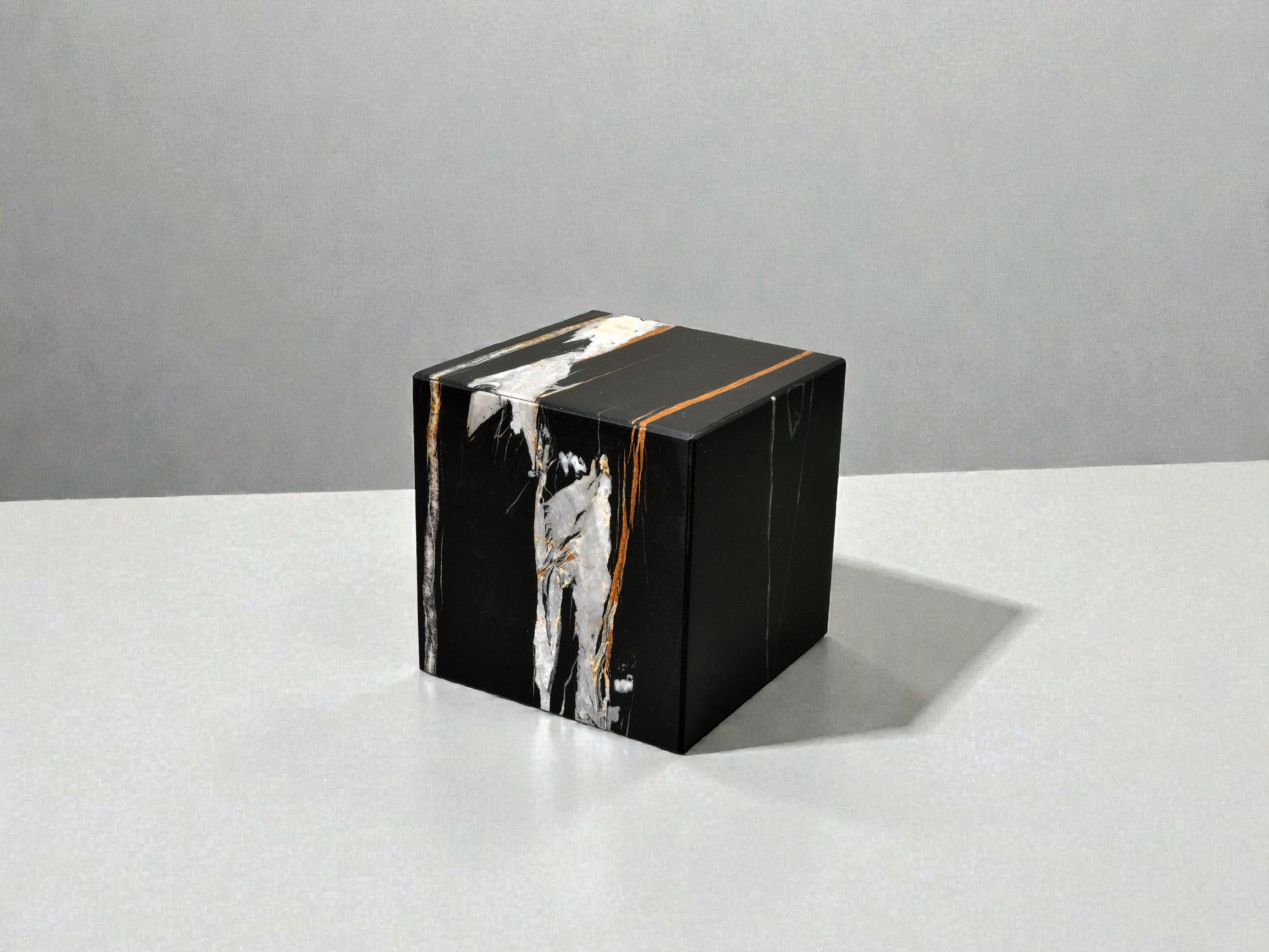 Crafted from honed Saint Laurent marble, this 6" × 6" × 6" base features deep black tones contrasted by natural white and warm rust veining. The crisp geometry enhances the dramatic movement of the stone without distraction.