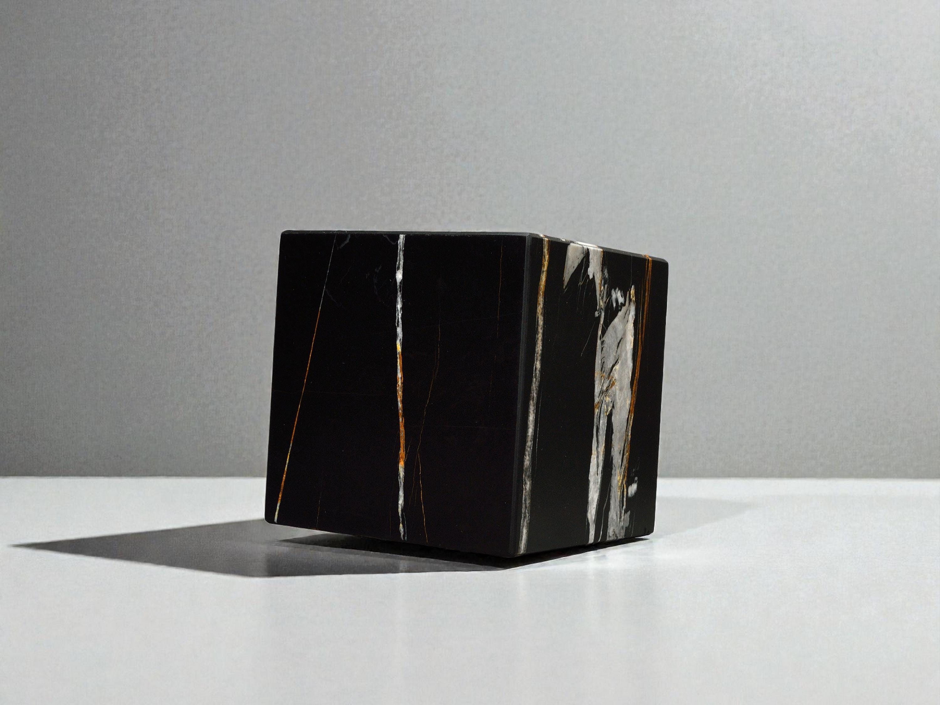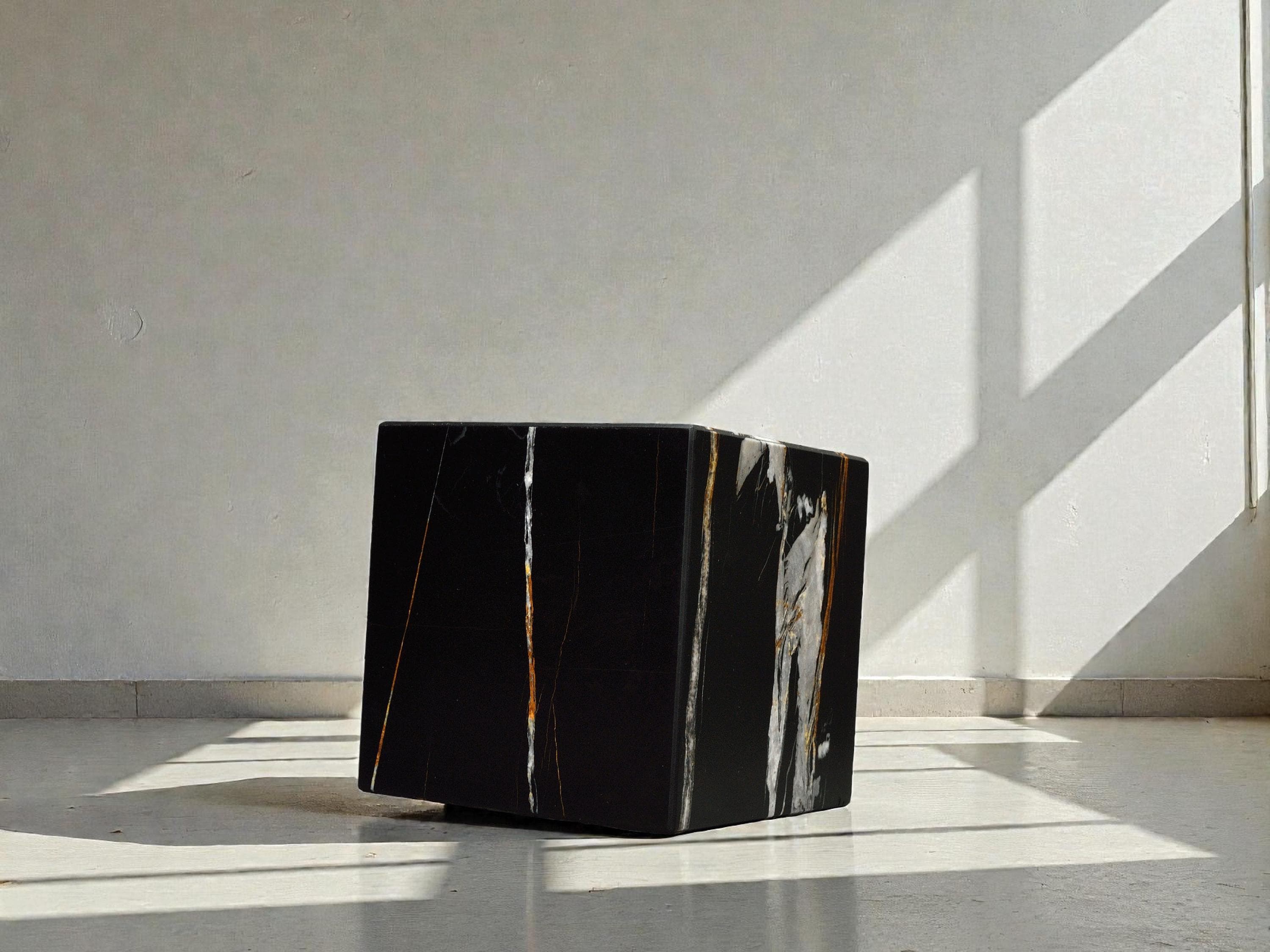 A 6x6x6 honed Saint Laurent marble cube from the DizzyStone Architectural Series – Quiet Form. A bold black stone display base designed to elevate sculpture, art objects, or luxury interiors.