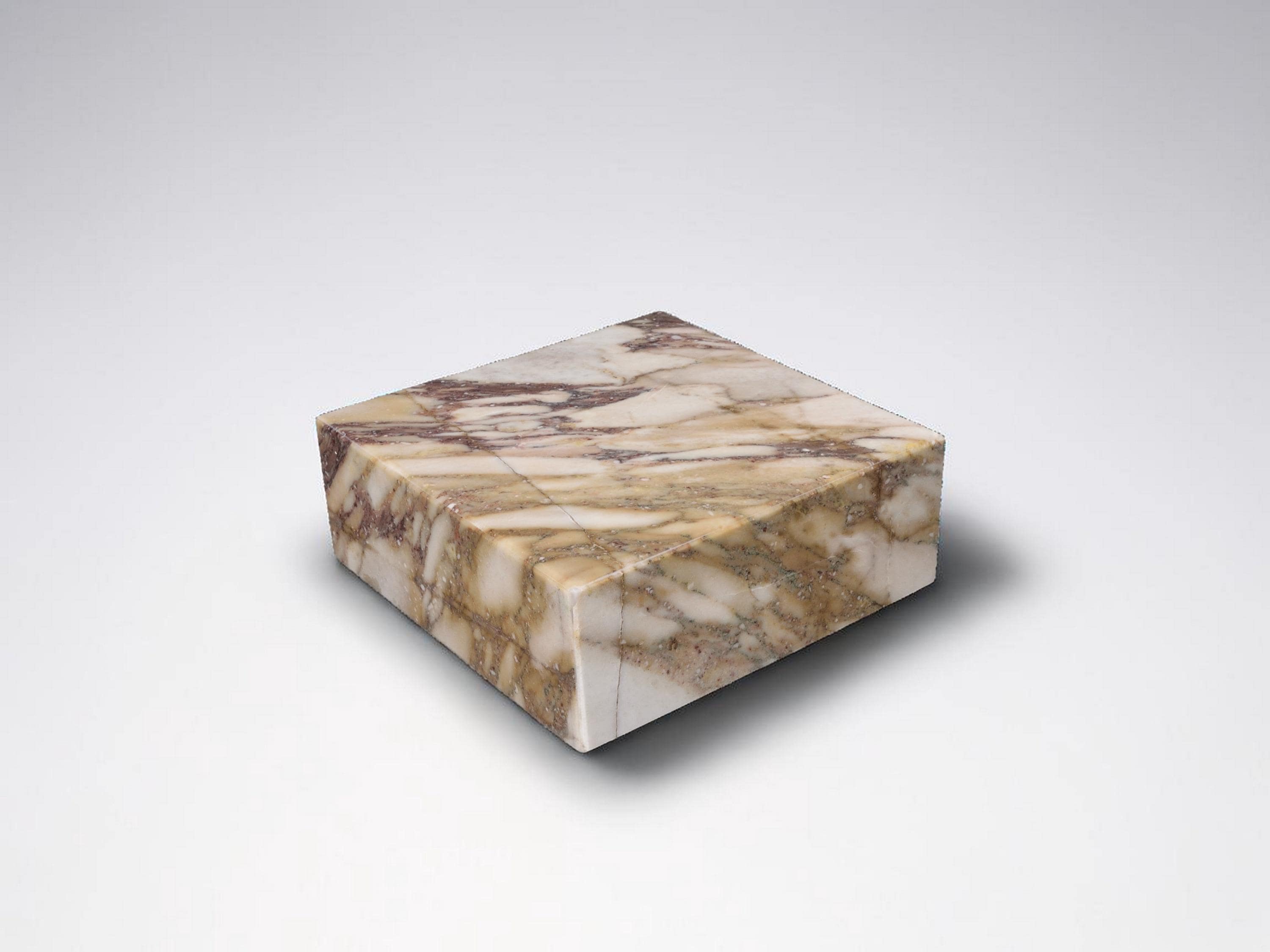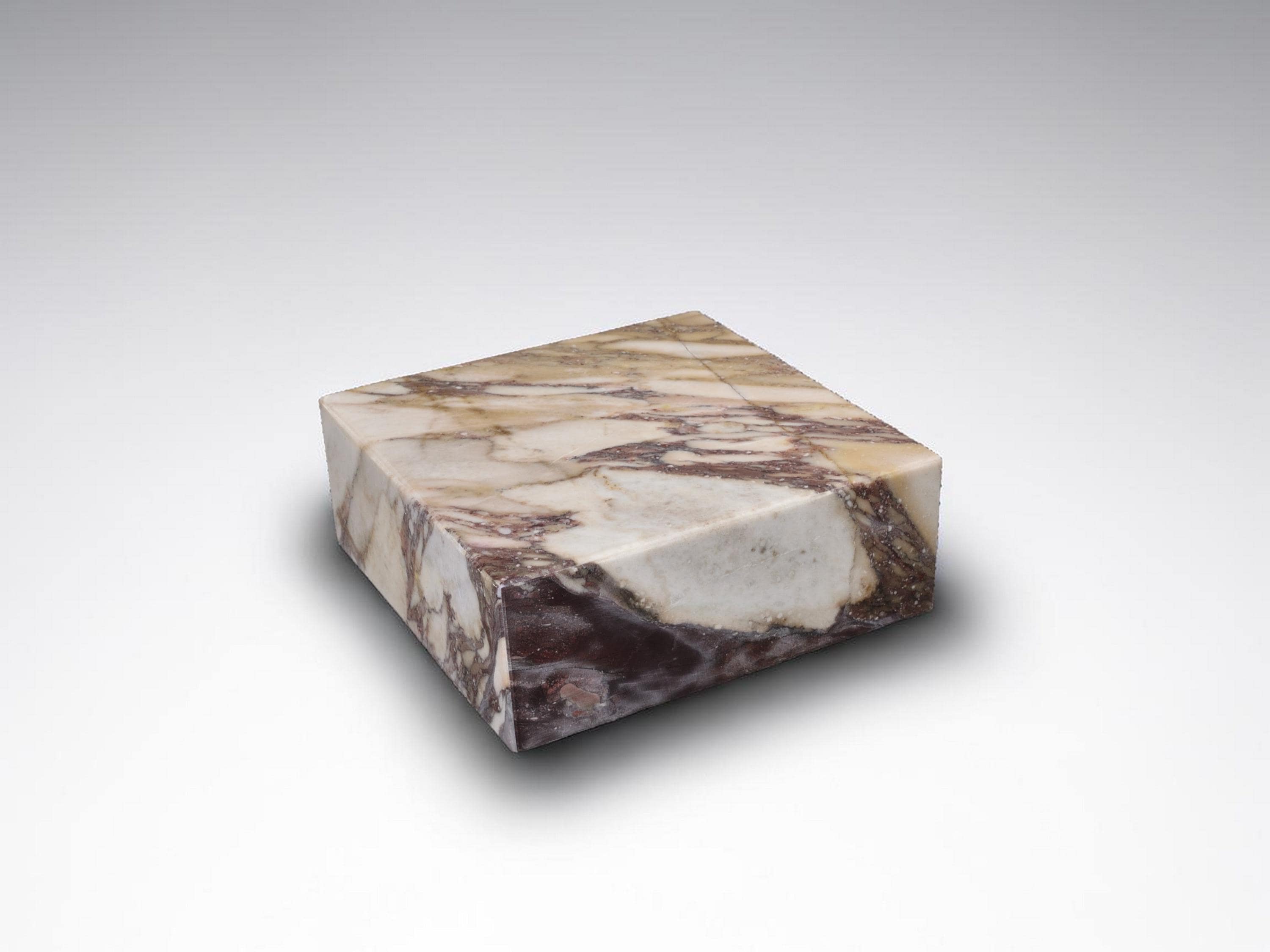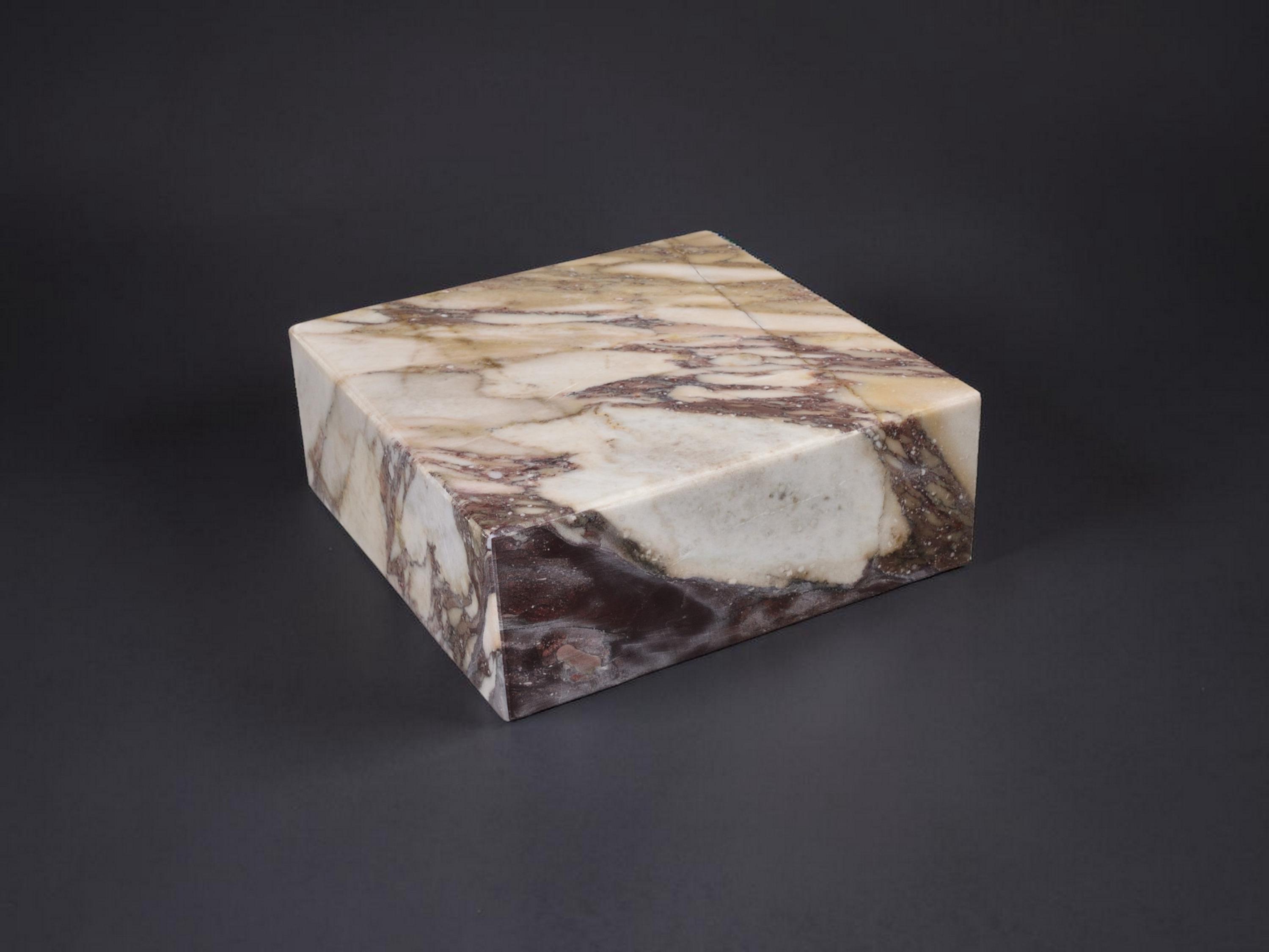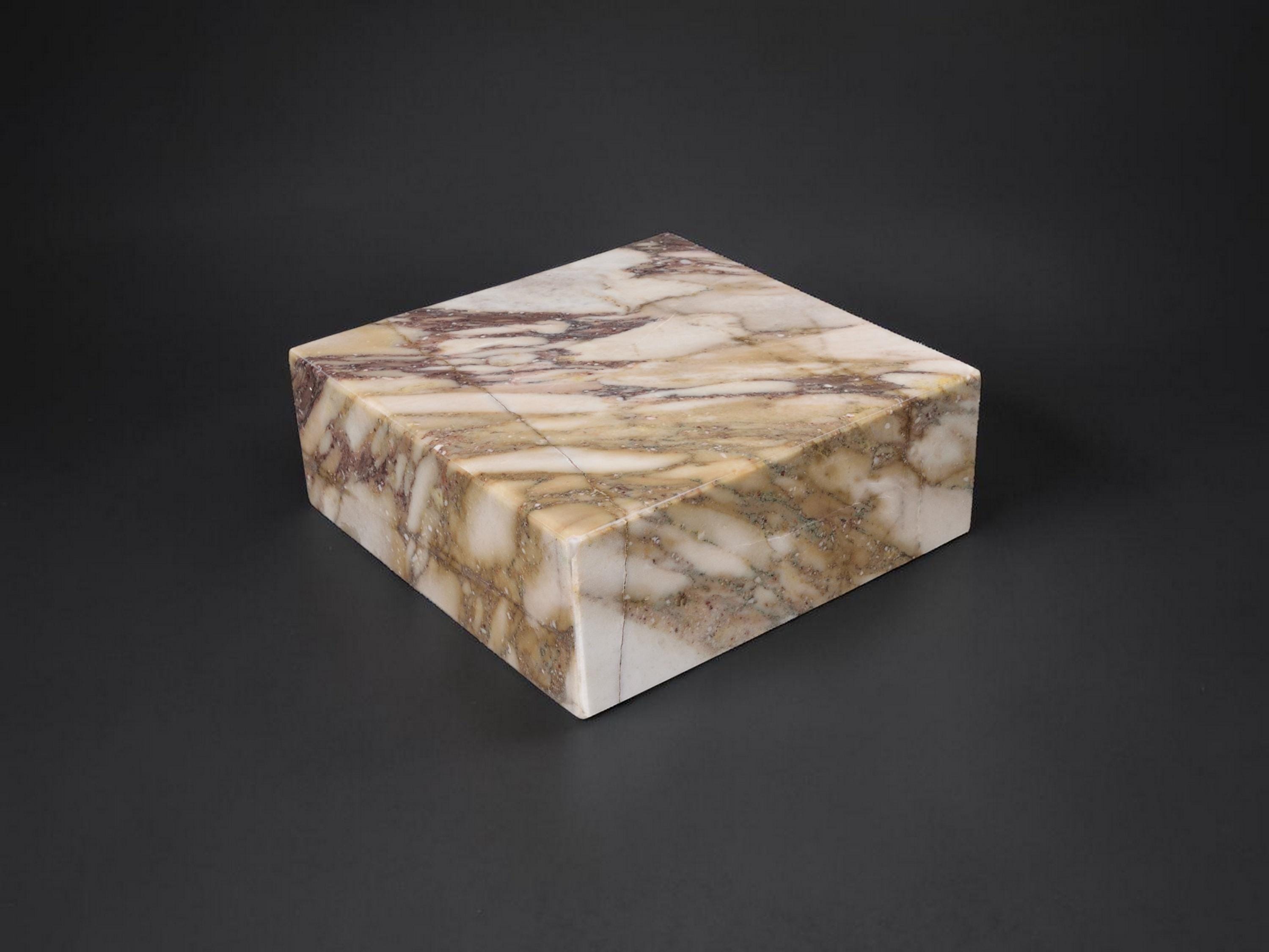 This display base is made from Calacatta Viola marble, known for its white background and deep purple veining. Solid, heavy, and stable, it’s designed to support sculptures, art objects, crystals, or collectibles.
